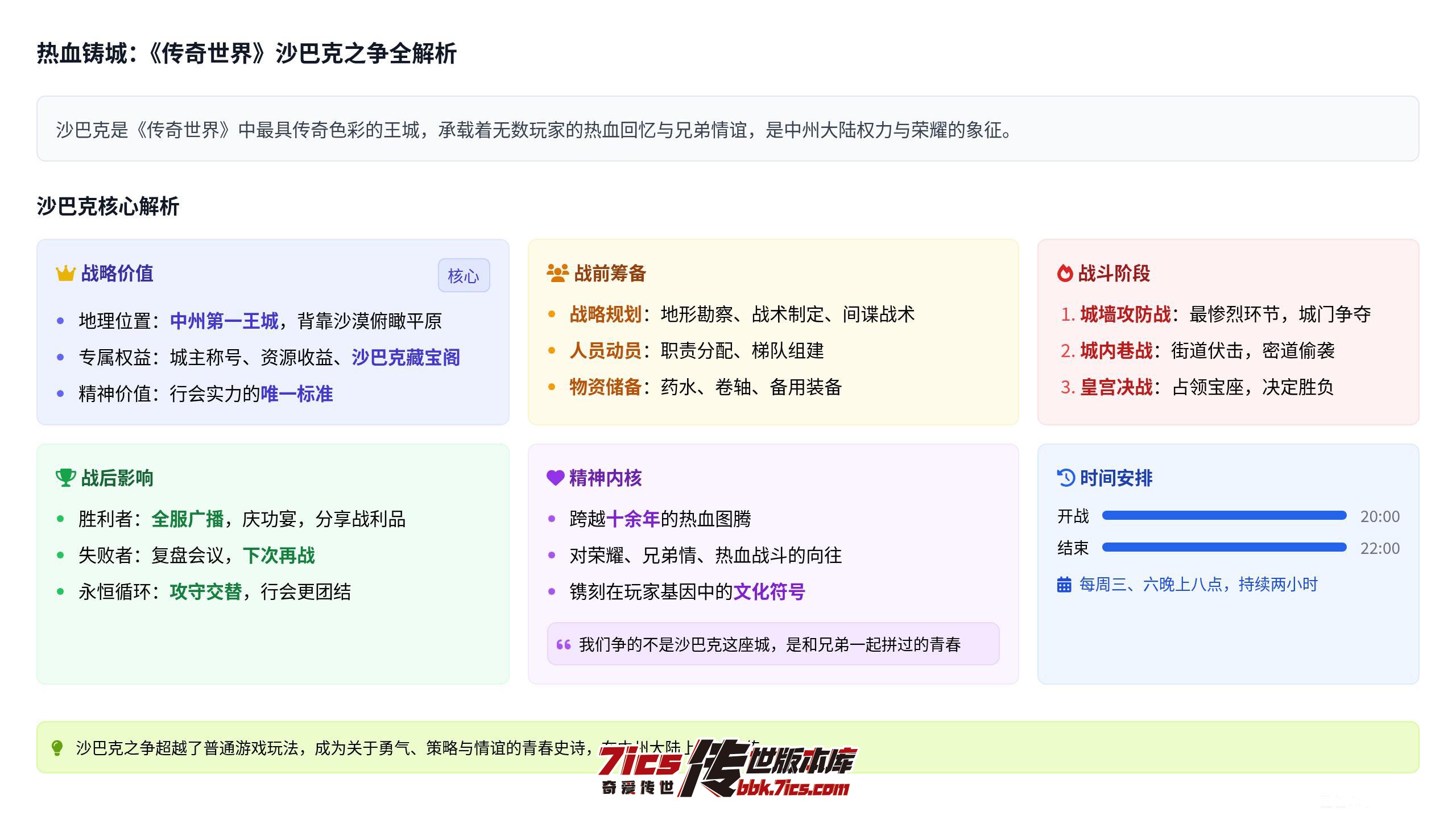热血铸城:《传奇世界》沙巴克之争全解析在《传奇世界》的中州大陆上,没有哪一场战役能像沙巴克之争那样,跨越十余年依然是玩家心中的热血图腾。这座矗立在玛法边缘的王城,不仅是游戏中权力与荣耀的顶点,更承载了无数玩家的兄弟情谊与青春记忆。从行会集结的号角到城墙攻防的厮杀,从策略布局的博弈到胜利时刻的狂欢,沙巴克之争早已超越了普通游戏玩法的范畴,成为一种镌刻在玩家基因中的文化符号。 一、沙巴克:为何成为必争之地?沙巴克的核心魅力,源于其“中州第一王城”的绝对地位。在游戏设定中,这座城池坐落于战略要冲,背靠沙漠而俯瞰平原,进可号令群雄征战四方,退可凭借高大城墙坚守待援。而除了地理优势,系统赋予的专属权益更是让所有行会趋之若鹜——占领沙巴克的行会将获得“沙巴克城主”的至高头衔,全体成员可使用专属称号彰显身份;城池内的商铺、铁匠铺等设施能为行会带来稳定的资源收益,让行会发展步入快车道;更重要的是,沙巴克城主可开启专属副本“沙巴克藏宝阁”,获取全服稀缺的装备与道具,形成实力碾压的良性循环。 但比物质奖励更珍贵的,是沙巴克承载的精神价值。在《传奇世界》的社交生态中,能否拿下沙巴克是衡量一个行会实力的唯一标准。为城主而战、为兄弟而拼的口号,让原本陌生的玩家凝聚成生死与共的团队,这种“一荣俱荣,一损俱损”的归属感,正是沙巴克之争最动人的底色。 二、战前筹备:一场没有硝烟的博弈沙巴克之争的胜负,往往在开战前就已埋下伏笔。一场合格的战前筹备,需要兼顾战略规划、人员动员与物资储备三大核心,少则一周,多则数月。 战略布局是筹备的核心。行会管理层会提前一周勘察沙巴克地形,标注城墙薄弱点、复活点、密道入口等关键位置,并根据对手行会的作战风格制定战术——若对手擅长正面强攻,便安排“法师+道士”组合在城墙布下火墙与毒阵;若对手习惯偷袭密道,就派高血量战士组成“守关队”死守咽喉要道。同时,行会会通过“间谍战术”打探对手的人员数量、核心战力分布,甚至故意放出虚假作战计划迷惑对方。 人员动员则考验行会的凝聚力。管理层会通过行会频道、QQ群、语音频道反复强调战役重要性,明确各成员的职责:战士负责正面突破与守旗,法师承担范围输出与清场,道士则专注于治疗、施毒与召唤神兽辅助。对于核心战力,会提前分配“定制任务”,比如让高等级战士紧盯对方城主,让极品法师守住复活点;对于普通成员,则会组建“梯队”,确保战斗中有人受伤退场时能及时补位。 物资储备是战斗的“后勤保障”。行会会集中收集金币、药水、卷轴等物资,为成员统一发放——战士配备大量超级金疮药与太阳水,法师准备充足的魔法药,道士则囤积解毒药与护身符。更有实力雄厚的行会会提前打造一批“备用装备”,供成员在装备损坏时紧急更换,避免因装备问题退出战斗。 三、战时厮杀:从城墙到皇宫的生死较量沙巴克之争的正式开战时间为每周三、六晚上八点,持续两小时,但真正的厮杀往往在开战前半小时就已打响。当系统提示“沙巴克攻城战即将开始”时,攻守双方会率先在沙巴克城外的“猪洞入口”“沙漠土城”等集结点爆发遭遇战,目的是消耗对方的药水与战力,为正式攻城扫清障碍。 晚上八点整,攻城战正式开启,战斗会迅速分为三个阶段推进。第一阶段是“城墙攻防战”,这是整场战役最惨烈的环节。攻城方会集中所有法师在城墙下释放“冰咆哮”“流星火雨”,用范围技能压制城墙上的守方;同时,高等级战士会借助“野蛮冲撞”突破守方的前排防线,试图爬上城墙打开城门。守方则会在城墙垛口后密集输出,道士释放“群体施毒”,法师用“火墙”封锁城墙台阶,战士则用“烈火剑法”斩杀试图登城的敌人。城门口往往是争夺焦点,攻防双方会在这里反复拉锯,尸体堆积如山,药水与技能特效交织成一片混乱的光影。 第二阶段是“城内巷战”。当攻城方突破城墙或炸开城门后,战斗会进入城内街道。此时攻方会兵分两路:一路主力直奔皇宫,试图占领核心区域;另一路则负责清剿城内的守方残余势力,防止后方被偷袭。守方则会利用街道狭窄的地形设置“伏击点”,在拐角处安排法师释放“火墙”,道士在暗处施毒,战士突然冲出收割残血敌人。密道成为关键战场,攻方会派小股精锐通过密道直插皇宫后院,守方则会派专人死守密道出口,一场“短兵相接”的恶战在所难免。 第三阶段是“皇宫决战”。这是决定胜负的最后环节,规则是“占领皇宫且在战役结束时保持控制权”。攻方会集中所有核心战力强攻皇宫大门,法师用“雷电术”破坏大门血量,战士合力击杀守门的守方精锐;一旦大门攻破,便迅速冲入皇宫内抢占“城主宝座”。守方则会在皇宫内形成“环形防御圈”,以宝座为中心层层设防,道士持续为队友加血,战士死守宝座周围,法师则用范围技能清理冲进来的敌人。此时,双方的行会会长会亲自下场指挥,通过语音频道喊出“集火那个法师”“守住宝座”等指令,整个皇宫内技能漫天飞舞,血量提示不断闪烁,每一秒都充满变数。 四、战后余韵:荣耀与遗憾的双重回响当系统提示“沙巴克攻城战结束”的瞬间,沙巴克城会陷入短暂的寂静,随后便是胜利者的狂欢与失败者的沉默。占领沙巴克的行会成员会自动获得