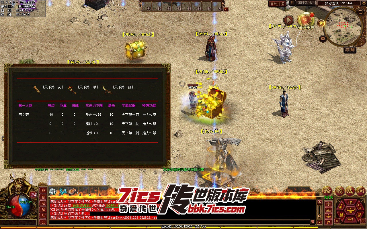 22、名人榜:48级自动申请名人榜,上榜玩家可获得天下第一武器,具有隐藏属性。