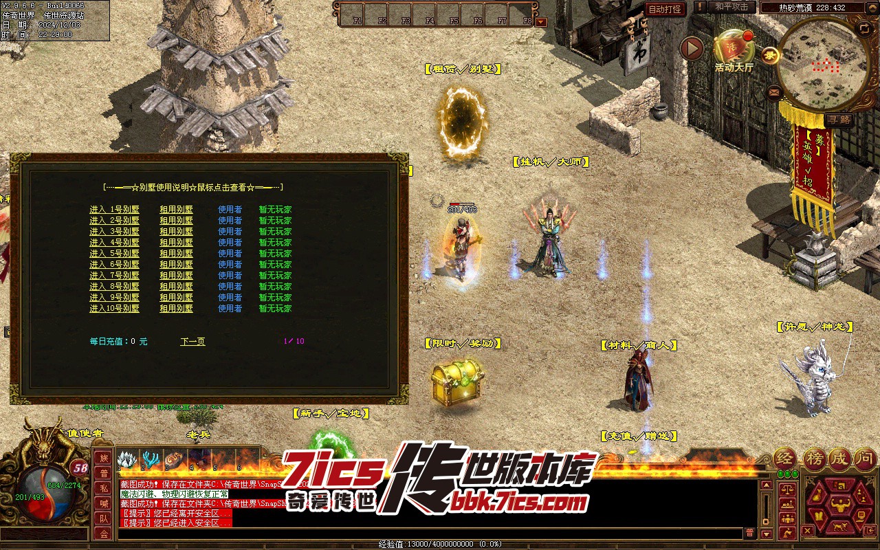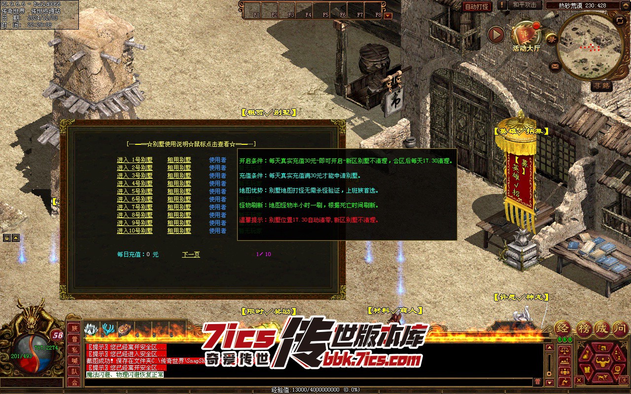 23、独家别墅:真实充值30元宝可获得别墅使用权一天,材料爆率极高,装备爆率较低。