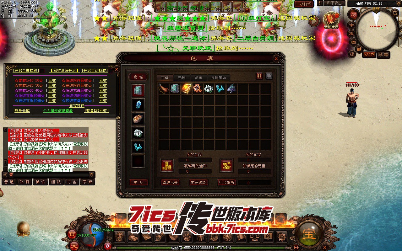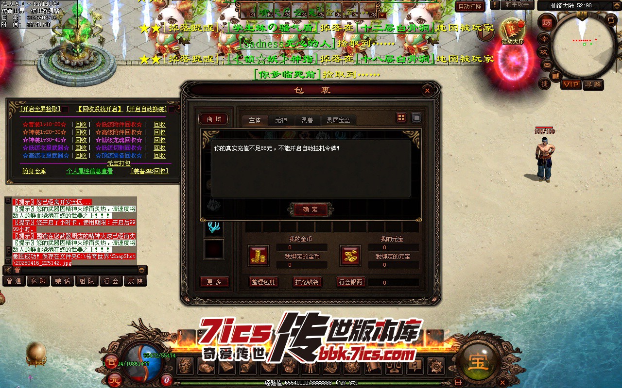 白嫖玩家上线领取礼包码2022888之后把全屏拾取.自动换装.自动回收一键全部勾选,打到的装备会优先替换身上低级装备在回收